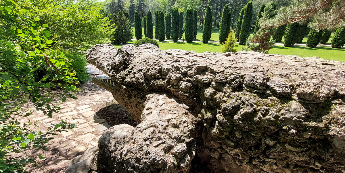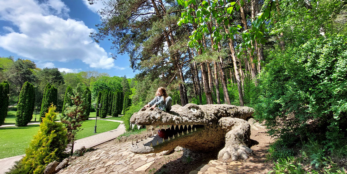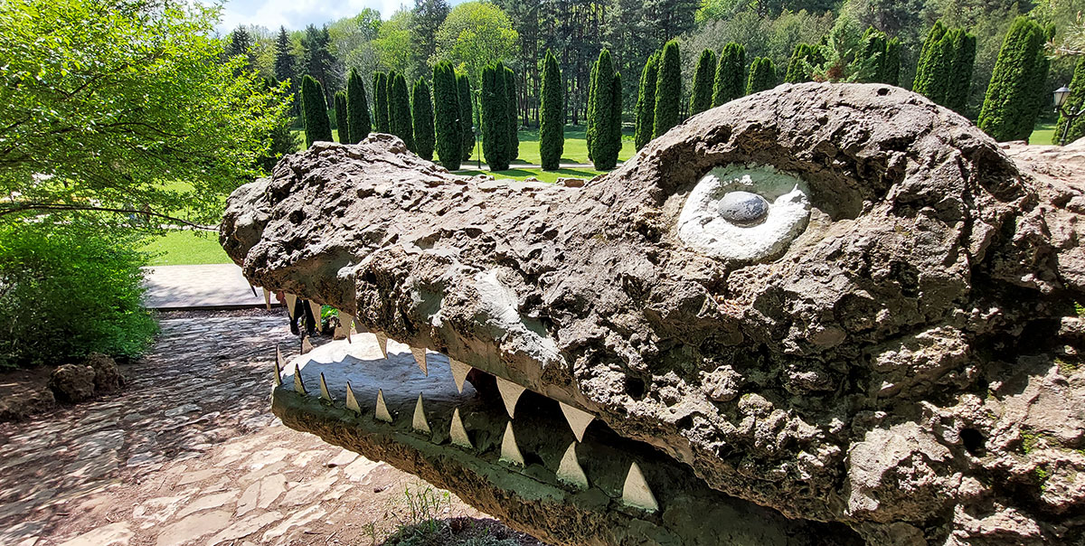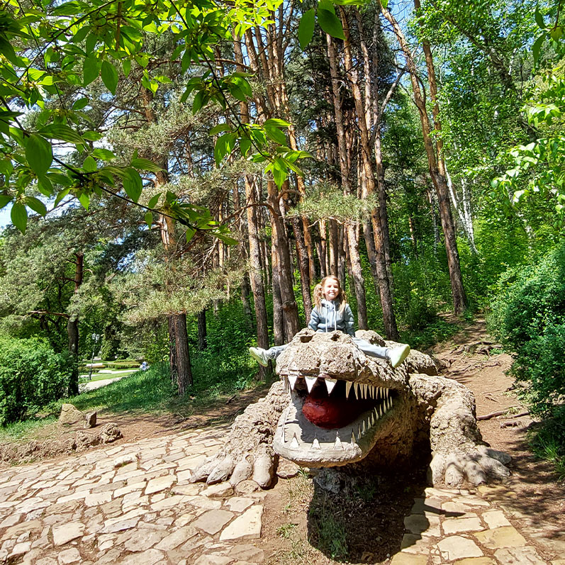 Огромная каменная рептилия приютилась в березняке, грозно выглядывая оттуда и сверкая острыми, жестяными зубами. Крокодил возле Долины роз в Курортном парке давно превратился в известную локацию, идеально подходящую для оригинальных фотосессий.