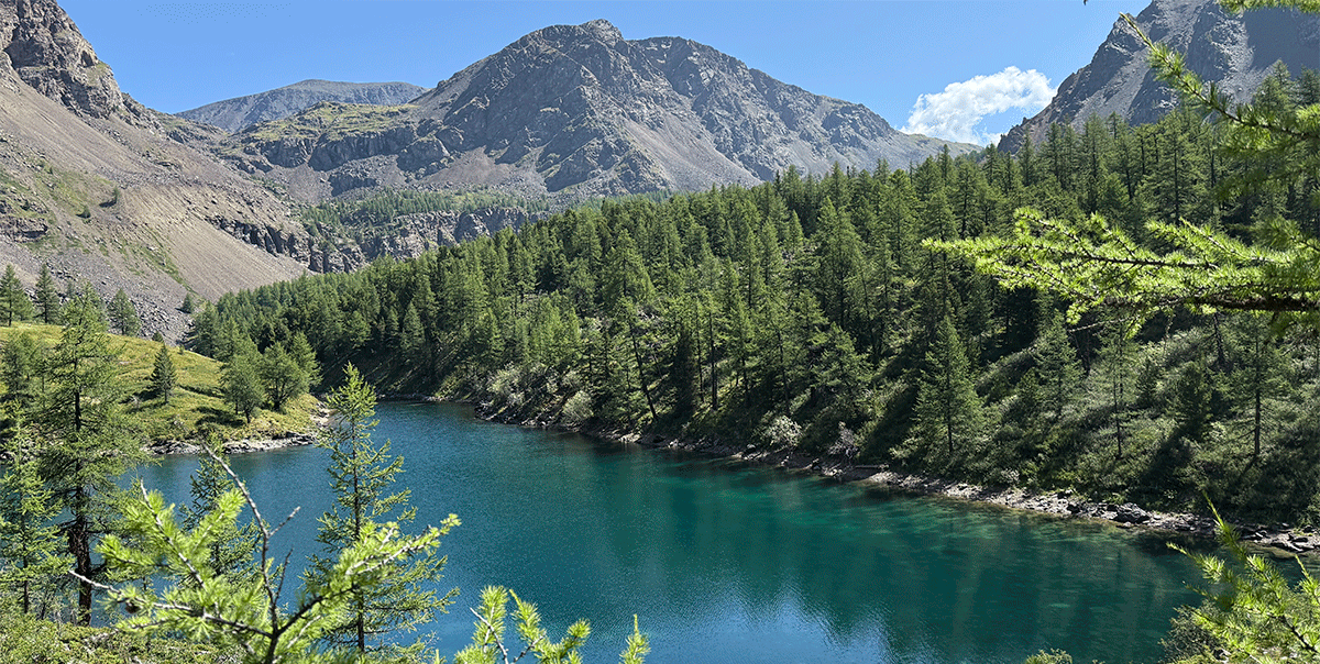 Лес Гномов, долина реки Актру и зеленый водоем.