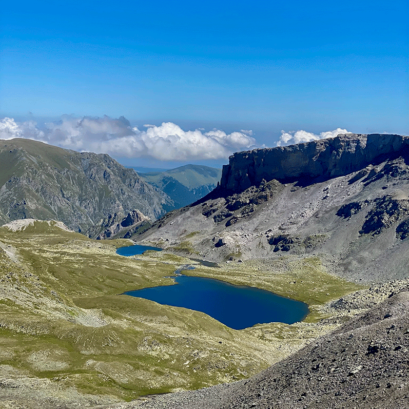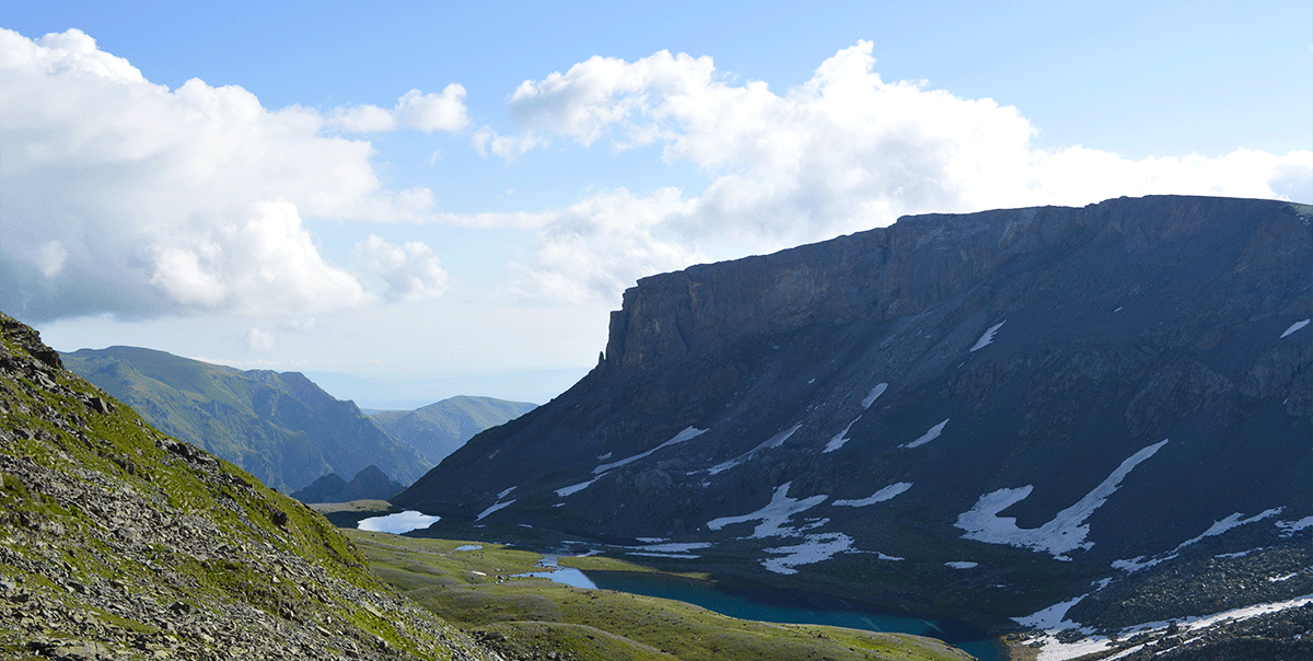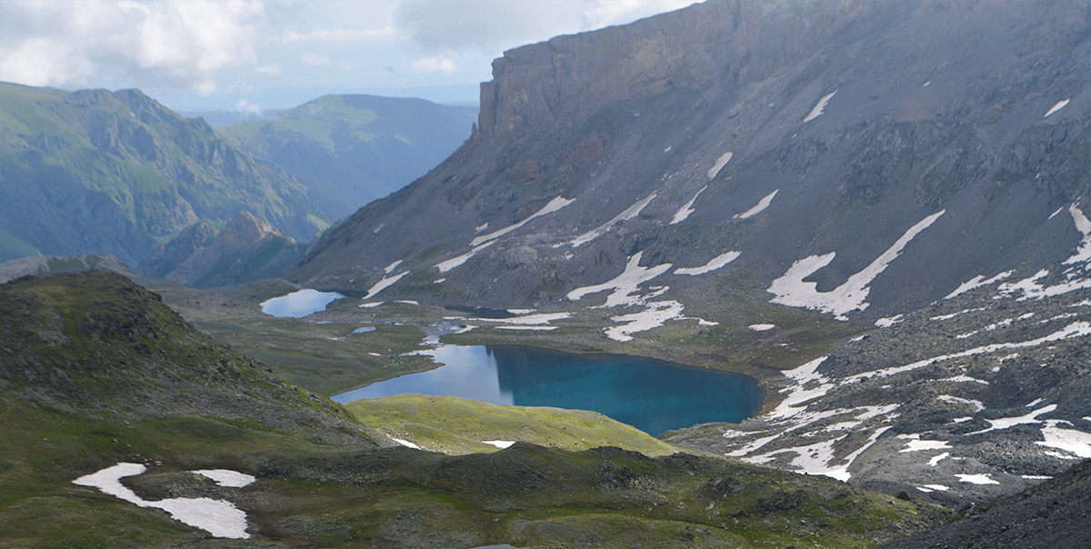 Малая Дукка, будто тяготится каменными тисками и шумно бурлит в отвоеванной у природы теснине. Треккинг пролегает по альпийским лугам, летом расцветающим наивно-голубыми незабудками, нарядно-розовыми горцами, серебристо-лавандовыми колокольчиками и мохнатыми рододендронами. Минуя эту горную клумбу, мы приблизимся к первому озеру, прозрачная вода которого отливает насыщенным малахитом.