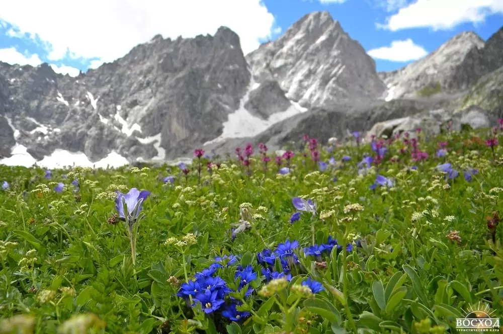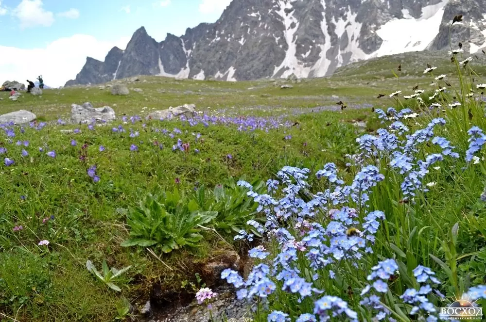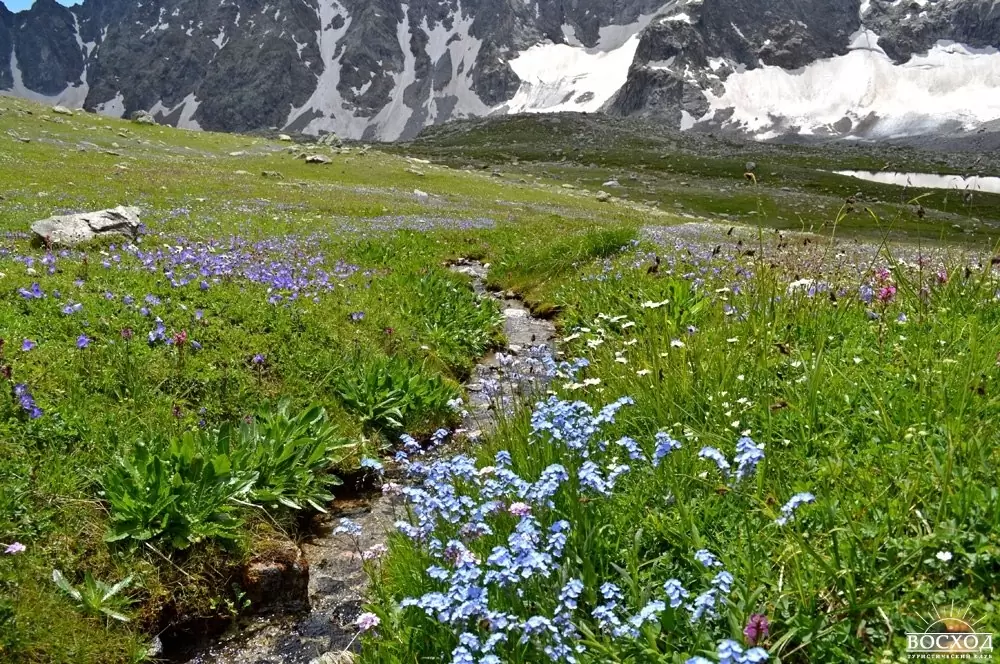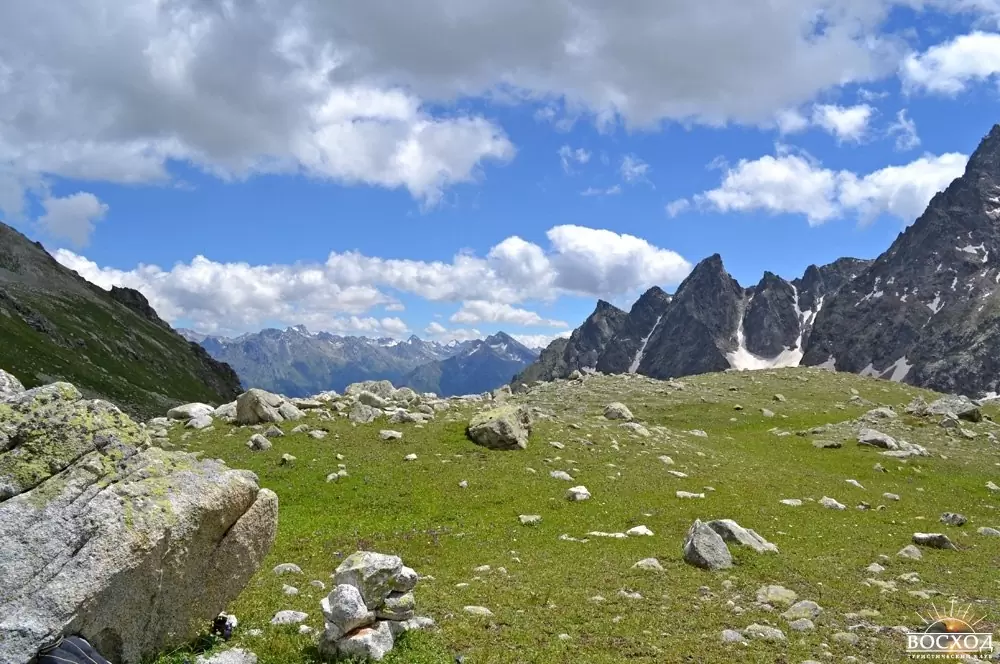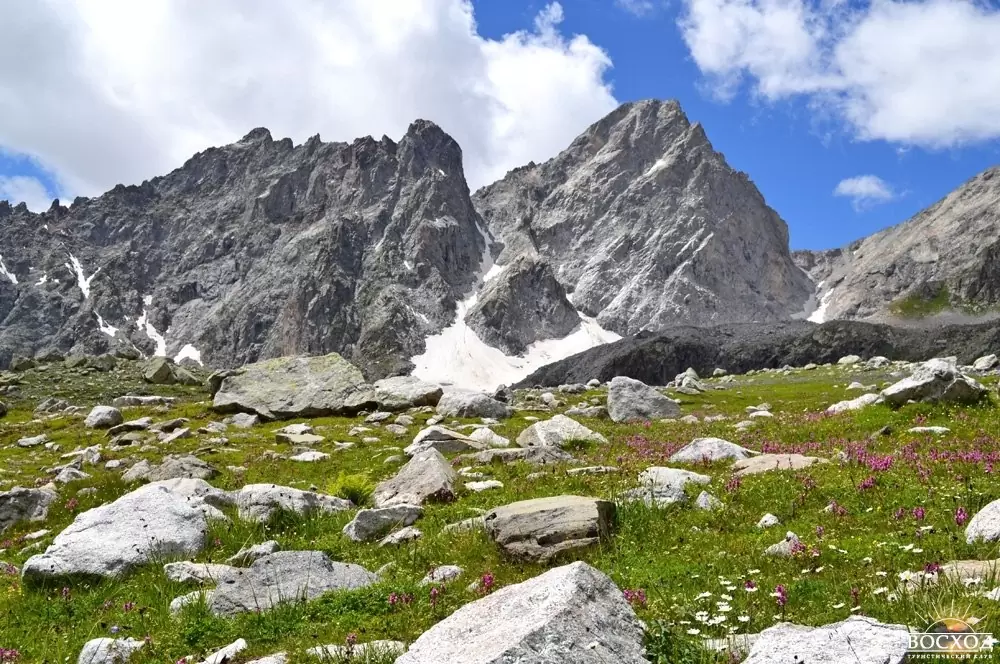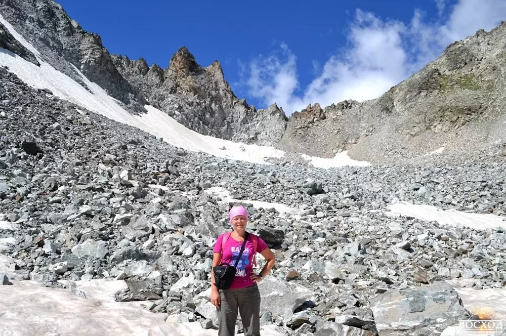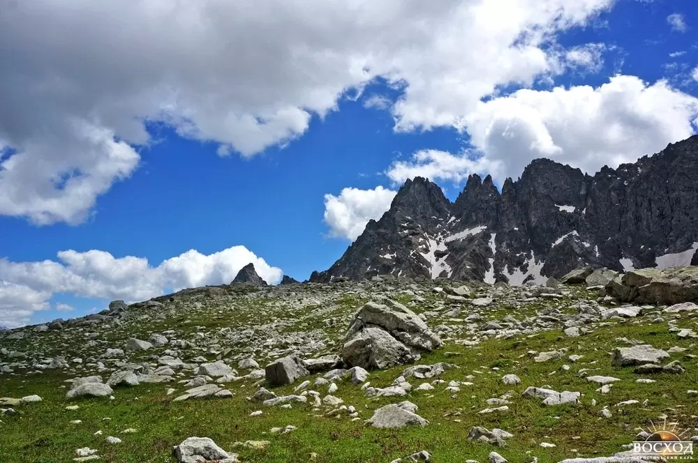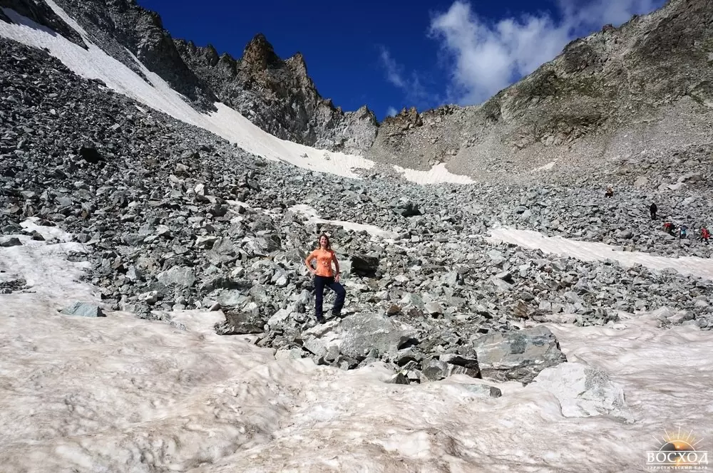 Начиная с высоты 2500 м, в ущелье исчезают кустарники, трава становится ниже и дальнейший путь к перевалу уже идет по огромным валунам. Даже в середине лета в небольших ложбинках и на затененных участках здесь все еще лежит снег!