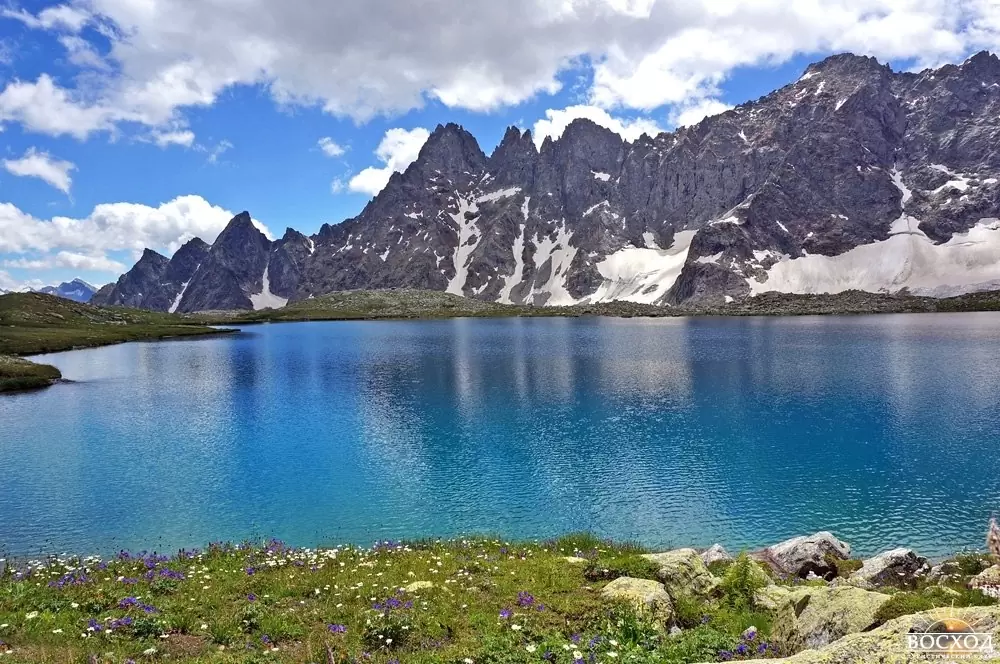 В солнечную погоду озеро меняет свои краски от темно-изумрудного до небесно-голубого цвета! Из озера вытекает река, которая делает несколько красивых, игривых изгибов и убегает вниз, в долину, чтобы встретиться с горной рекой Бадук.