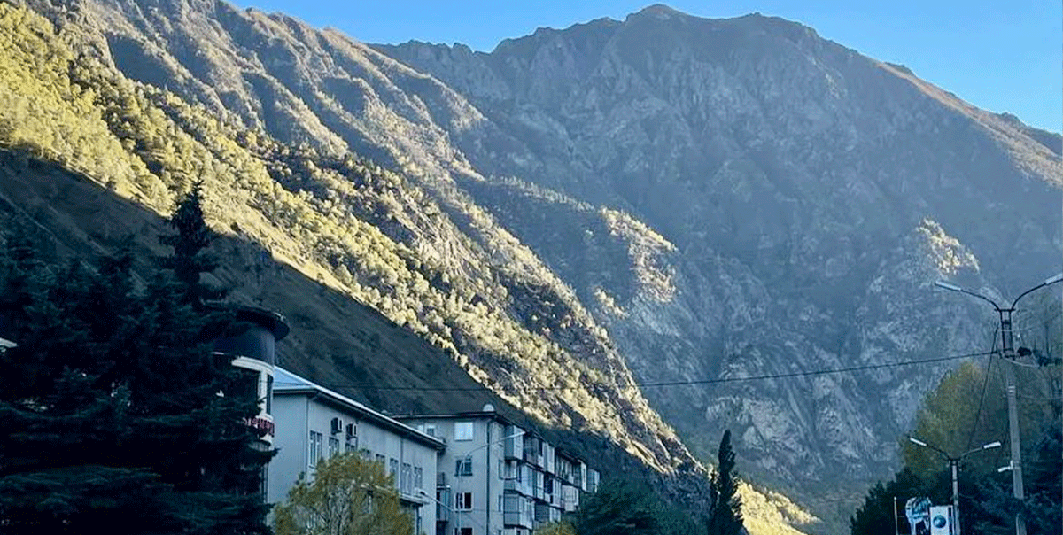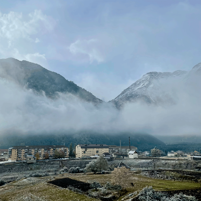 Накупавшись вдоволь, мы отправились на вкусный обед и попробовали местное блюдо - Хычин, тонкий блин из пресного теста с различными начинками. После плотного обеда мы отправились в сторону нашей гостиницы, которая была расположена в поселке Терскол. Нас ждала живописная дорога, проходившая через Баксанское ущелье. С каждым километром горы росли прямо на глазах. Нам повезло увидеть Приэльбрусье во время золотой осени.
