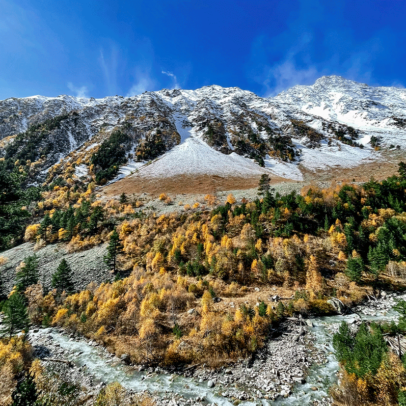 Вдохновившись и поставив новые цели (у каждого они были свои), мы начали спуск в сторону водопада. Из-за перепада высот голова была шальная, но стакан кофе быстро все исправил. И снова перед нами золотая осень с намеком на недавно выпавший снег. И снова знакомая нам дорога в гостиницу, но мы уже возвращались другими: наполненные положительными эмоциями и новыми целями, ощутив все красоты Приэльбрусья и вдохновившись силой природы России.
