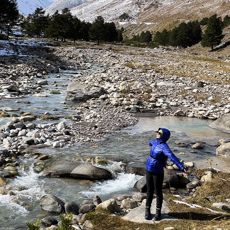 Треккинг пролегал через живописный маршрут вдоль реки и соснового леса. Я впервые взяла в руки треккинговые палки, которые предоставил турклуб, и начала учиться ими орудовать)) Были непривычные ощущения, вроде лыж нет, а палки есть). Но после они стали для меня жизненно необходимым элементом в горах, самая что ни на есть поддержка. По началу было сложно без подготовки начать подъем, но благодаря поддержке Гида и красотам вокруг- ты отвлекаешься и начинаешь получать удовольствие. Как только мы дошли до водопада Терскол и поднялись на 600м вверх - ты понимаешь ради чего все было нужно) Тебя встретил мощный шумный водопад с распростертыми руками и сказал: «Ты все можешь!». Было приятно получить и поддержку Гида в виде дружеских похлопываний по плечу в знак что «Ты смогла, ты это сделала, несмотря на трудный подъем!» И вот, ты стоишь, гордишься собой и наслаждаешься этой силой природы - мощностью водопада, резкими горами, раскатистыми реками. Уставший, но воодушевленный.