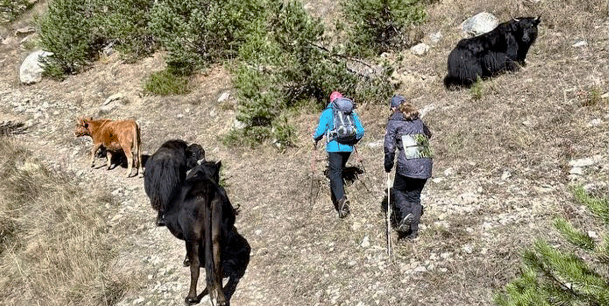 На маршруте мы встретили довольных быков, подружились с ними на пару минут, чтобы пройти их зону пастбища.