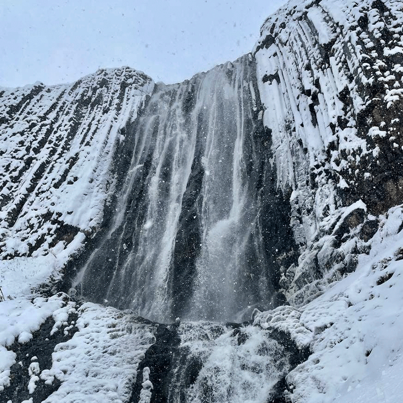 На пути нас ждали смотровые площадки и козья тропа, которая ведет к самому водопаду Девичьи косы. Поскольку выпал снег и тропа предстояла с резкими отравами, было трудно пройти без рекомендаций Гида. Гид взял нас под свое крыло, подсказал, как в таком случае ставить треккинговые палки, как опираться и как дойти)) Чувствовали себя горными турами, кстати, о них - встретили они нас на тропе. Чем не National Geographic? Дикая природа, животные в своей естественной среде обитания. И вот мы дошли до водопада. Как в прошлый раз нас Гид поддержал поздравлениями в виде похлопываний по плечу, которые нас взбодрили на новые подвиги. Ощутили на себе брызги водопада и почувствовали всю силу воды.