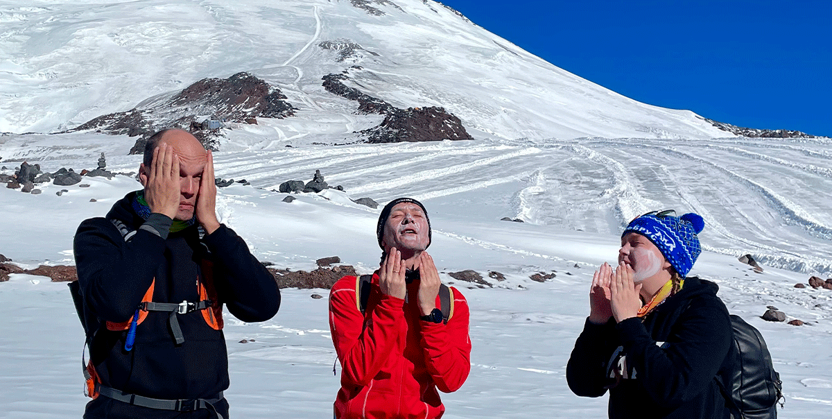 Тщательно намазали свои лица солнцезащитным кремом, даже искупались в нем, поскольку солнце на вершине никого не щадит))